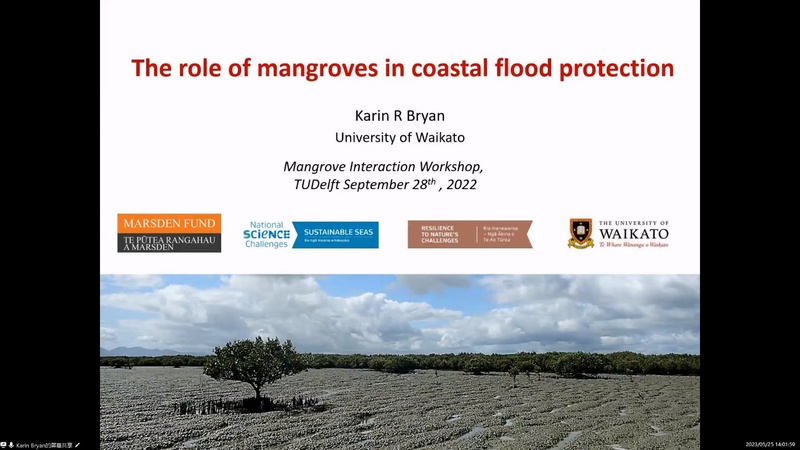 Karin Bryan 教授的第一场报告以新西兰区域为例,详细介绍了红树林系统在海岸防护中起到的关键作用。通过野外观测与数值模拟结合的研究方法,Karin Bryan 教授探究了红树林系统与海岸动力地貌以及滨海灾害的相互影响,报告指出,红树林系统起到了减少风暴淹水与促进垂向淤积的关键作用,并探究了潮沟在地貌演变中的作用。