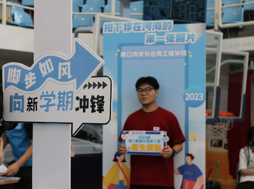 文体中心报到处,2023级本科辅导员、班导师、助学导师仔细核对信息,检查材料,为新生办理报到手续。新生们在办理完报到手续后,纷纷在合影点拍照留念,留下自己在河海港航的第一张照片。