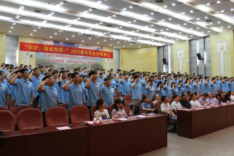 2023级本科生辅导员廖芳艺带领全体同学宣誓《做一名优秀的港航人》,典礼在校歌声中落下帷幕。