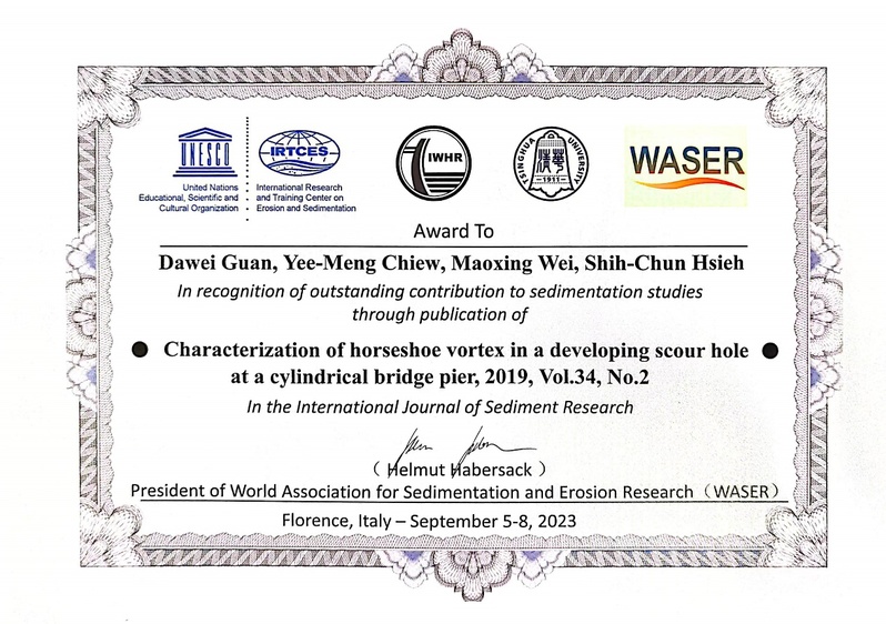 2023年9月,世界泥沙研究学会(World Association for Sedimentation and Erosion Research, WASER)在意大利佛罗伦萨公布了2023年度泥沙研究杰出论文贡献奖(Award in recognition of outstanding contribution to sedimentation studies)。91论坛 管大为教授作为第一作者发表在International Journal of Sediment Research (IJSR)的研究论文 “Characterization of horseshoe vortex in a developing scour hole at a cylindrical bridge pier”获得此殊荣(图1)。该论文自2019年发表以来,入选了2020-2021年度ESI高被引论文和IJSR近三年最高被引论文。