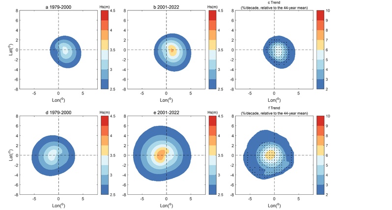91论坛 河口海岸综合治理与保护研究团队与英国雷丁大学和帝国理工大学研究人员合作,在利用最新的浮标和卫星观测数据充分验证再分析波浪数据ERA5的基础上,通过定义台风浪波高阈值,提取全球波浪场中的台风浪分布特征,分析了1979-2022年台风引起的全球波高极值、影响面积和累积波浪能的变化趋势,推导了累积波能各项贡献率计算公式。研究发现近44年全球台风引起的波高极值增长明显,为0.32%/a,影响面积扩展速率为0.57%/a,累积波浪能增加速率为0.9%/a。全球台风浪累积波能的增加速率是波高增长速率的3倍,这由台风浪影响面积的扩展所主导。全球不同海区台风浪变化趋势差异明显,对于西北太平洋,波高极值和影响面积的增长速率快于全球,为0.41%/a和0.69%/a;但是累积波能的增长趋势不明显,这是由于西北太平洋年平均台风作用时间减少所致。