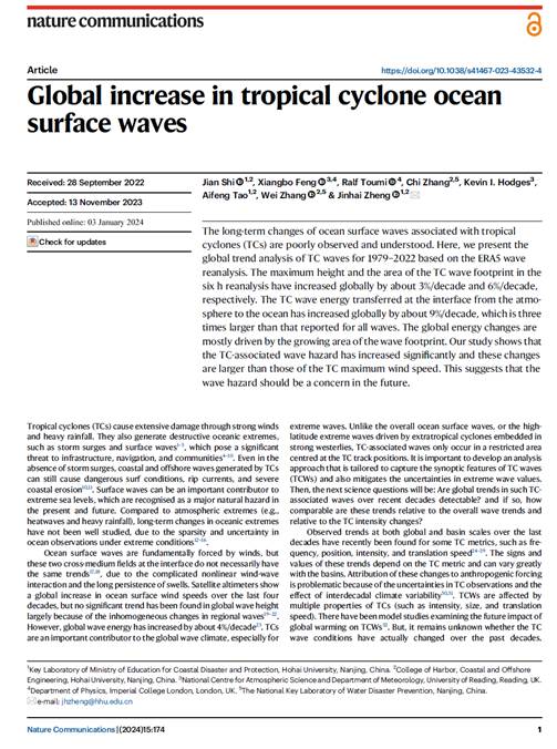 91论坛 时健副教授、郑金海教授、张弛教授、陶爱峰教授、张蔚教授和雷丁大学冯向波高级研究员、Kevin I. Hodges教授以及帝国理工大学Ralf Toumi教授合作完成的研究论文“Global increase in tropical cyclone ocean surface waves”发表在国际学术期刊《Nature Communications》上(//www.nature.com/articles/ s41467-023-43532-4),研究工作得到国家重点研发计划重大自然灾害防控与公共安全海洋专项(2023YFC3007900)的支持。