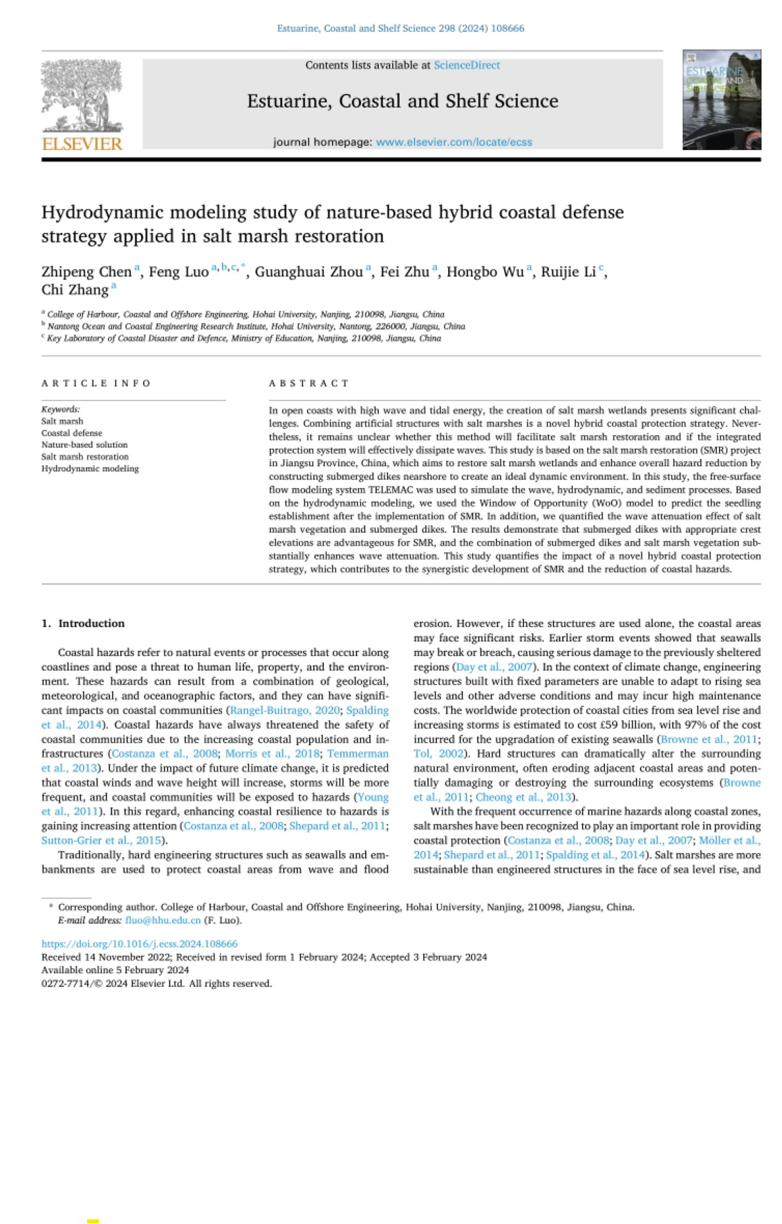 Chen Z, Luo F*, Zhou G, Zhu F, Wu H, Li R, Zhang C. Hydrodynamic modeling study of nature-based hybrid coastal defense strategy applied in salt marsh restoration[J]. Estuarine, Coastal and Shelf Science, 2024, 298: 108666. doi: //doi.org/10.1016/j.ecss.2024.108666