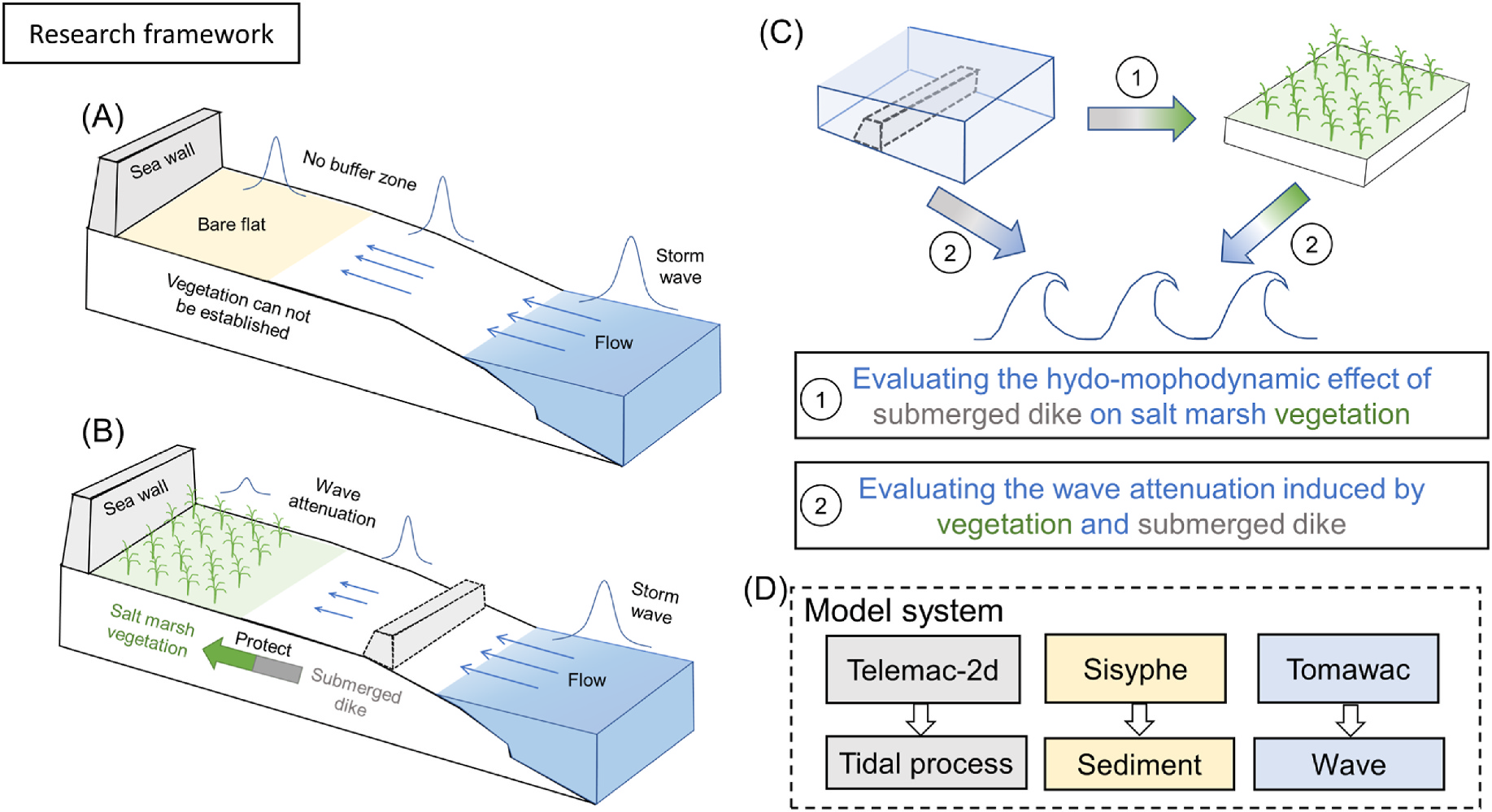 潮间带上复杂的波浪与潮流动力环境为重建盐沼湿地带来了重大挑战。将人工结构与盐沼相结合是一种新型的混合海岸保护策略(图1)。然而,目前此方案在实际盐沼恢复项目中的适用性尚不明确,以及该混合海防系统能否提供有效的波浪衰减效益仍有待进一步研究。研究基于可控潮汐通道海岸带保护修复与防灾减灾协同增效技术,以全国首批江苏首个海岸带保护修复工程(江苏南通海岸带保护修复工程项目)为研究对象,项目旨在通过在近岸建造潜堤为恢复盐沼湿地创造理想的动力环境,并增强整体减灾能力。研究采用了自由表面流模拟系统TELEMAC来模拟波浪、水动力和泥沙过程;基于此,采用机会之窗(WoO)模型预测了SMR实施后的种子与幼苗建立成功率(图2);采用TOMAWAC模型量化了盐沼植被和潜堤的波浪衰减效应。结果表明,具有适当堤顶高程的潜堤有利于盐沼恢复项目,潜堤与盐沼植被的结合显著提升了近岸波浪衰减。这项研究量化了一种新的混合海岸防护策略的影响,该策略的运用有助于实现盐沼恢复和海岸减灾协同增效,为未来海岸带生态修复工作提供新的视角。