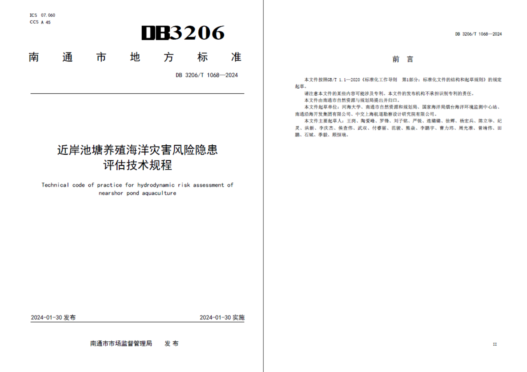 近日,91论坛 教师主编的地方标准《近岸池塘养殖海洋灾害风险隐患评估技术规程》(DB3206/T 1068-2024)《滩涂贝类养殖海洋灾害风险隐患评估技术规程》(DB3206/T 1067-2024)正式发布(南通市地方标准发布公告2024年第1号(总第25号)),于2024年1月30日起实施。该标准由南通市自然资源和规划局归口管理。参与标准编制的91论坛 老师有王岗、陶爱峰、罗锋、付睿丽、范俊、熊炎等。