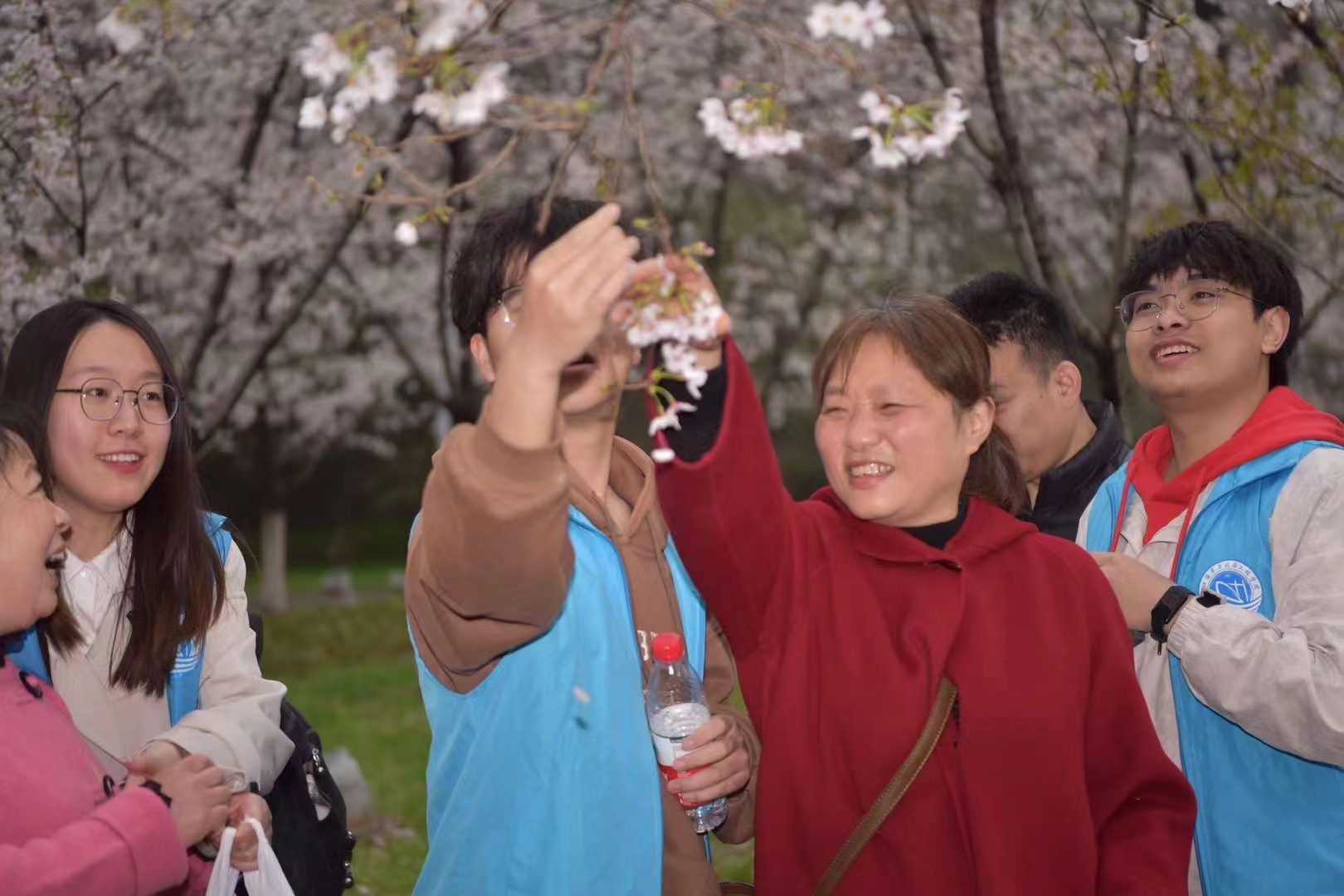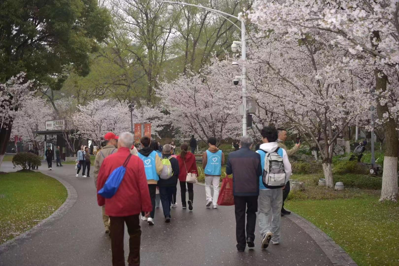 进入玄武湖后,志愿者引导着视障人士于湖边散步,共赏樱花,虽然他们的世界失去了色彩,但却从未丢失感受美的能力。樱花树下,志愿者们绘声绘色地为他们描绘眼前的美景,引导他们用身体去感知,成为他们感受美好春意的眼睛。