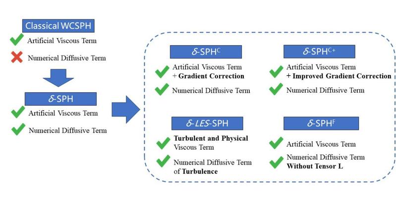 研究团队对多种弱可压缩光滑粒子流体动力学(WCSPH)模型进行了体积守恒性研究。近年来,不断有改进的WCSPH模型被提出,其中δ-SPH、δ-SPHC、δ-SPHC+、δ-LES-SPH和δ-SPHF等模型被广泛应用于海岸工程数值模拟,这些改进模型具有各自显著的特性(图1),并由此带来不同的体积守恒性。该研究通过长时间尺度、考虑多种分辨率与初始水深的静水、驻波和溃坝等3种算例(图2),测试这些模型模拟流体运动时,在演化自不同剧烈程度流动的“准静水”工况下水位随时间的变化过程,以对比这些模型的体积守恒性(图3)。该研究发现,在改进模型中δ-LES-SPH模型具有最好的体积守恒性,其它模型在分辨率较高的情况下体积守恒性满足长时间尺度的应用需求。该研究还发现δ-SPHF模型具有相对较弱的体积守恒性,对此本研究对该模型提出了新的数值改进。这项研究量化了多种改进WCSPH模型在长时间尺度下,由多种剧烈程度流动演化至静水状态后其水位的变化情况(图4),为未来WCSPH模型在海岸工程领域的应用提供了参考。