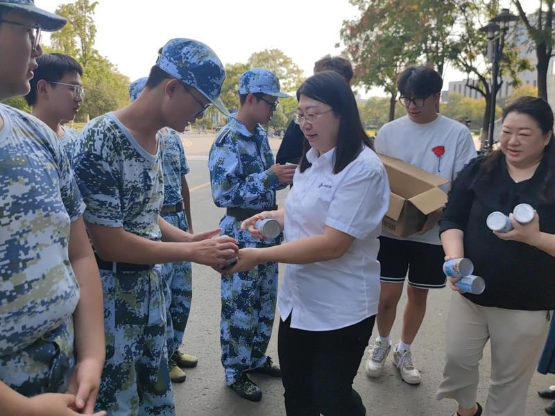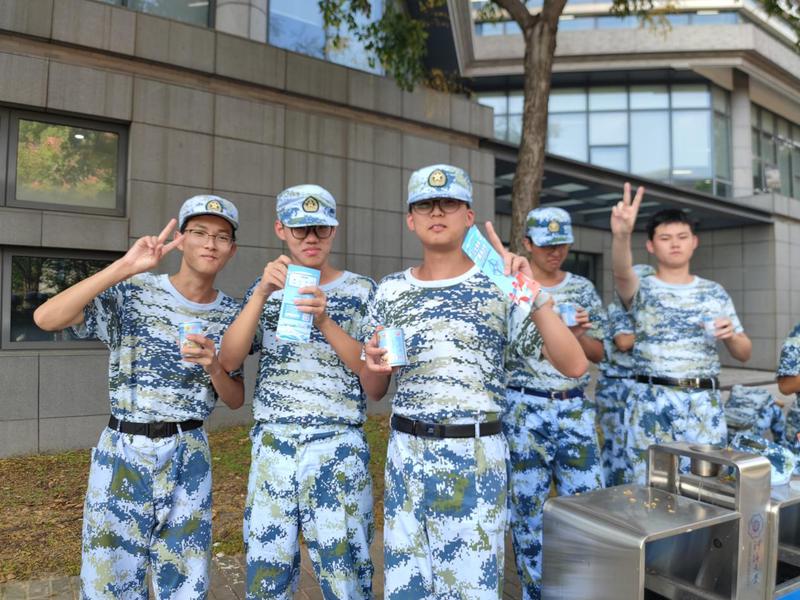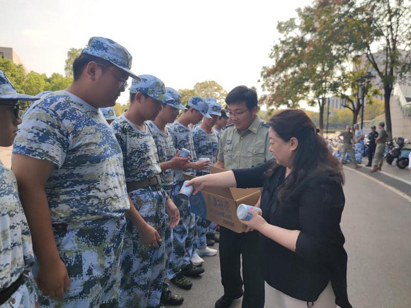 在炎炎烈日之下,中交三航局三公司的企业代表来到军训现场慰问我们,并送上了人手一罐的“椰奶清补凉”和暖心的慰问、鼓励。我们收获了一“夏”清凉,也了解到了中交集团的一些信息,同时也鼓舞了同学们的士气与斗志。