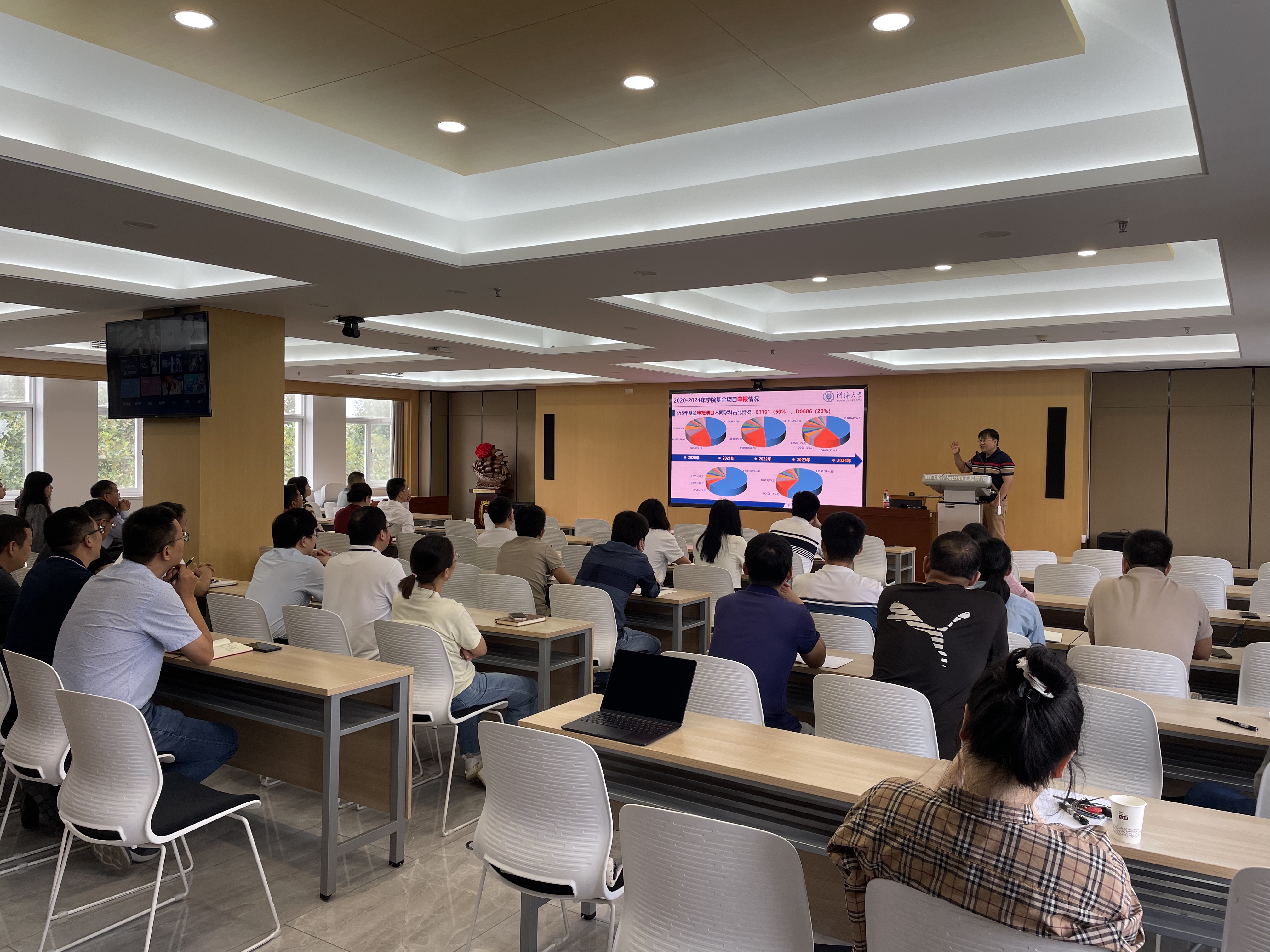 科技处副处长窦智对2024年度91论坛 整体申报情况、获资助情况做了介绍,并就91论坛 对2025年度国家自然科学基金项目申报的总体规划安排做了介绍。科研副院长张蔚对91论坛 2024年度国家自然科学基金申报情况做了总结汇报,分析了基金申报的问题,介绍了91论坛 2025年度国家自然科学基金申报的目标任务,并从基金辅导工作前置、精兵强将有的放矢、扩大拓展学科方向、抓住机遇先行先试四方面强调了基金申报工作重点安排。