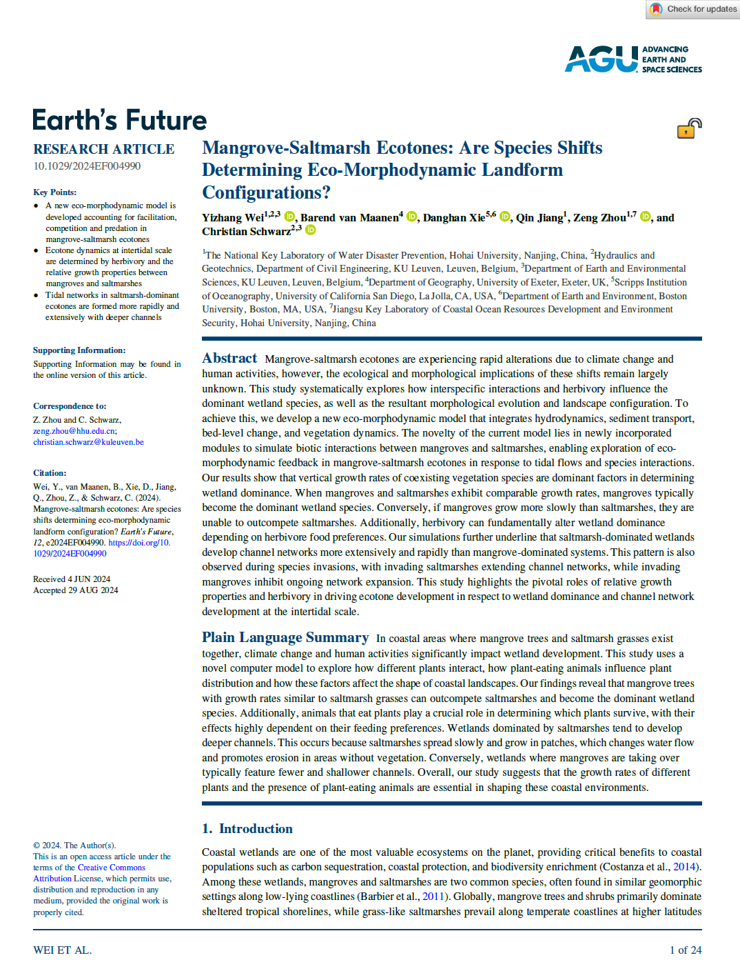 近日,Earth's Future期刊刊发了来自91论坛 的最新研究成果“Mangrove-saltmarsh Ecotones: Are Species Shifts Determining Eco-morphodynamic Landform Configurations?”(红树林-盐沼生态交错区:物种演变是否改变生态动力地貌格局),该成果的第一作者为91论坛 蒋勤教授和周曾教授联合指导的博士生韦以璋,论文其他合作者包括比利时鲁汶大学Christian Schwarz助理教授、英国埃克塞特大学Barend van Maanen副教授和美国加利福尼亚大学谢当汉博士后。