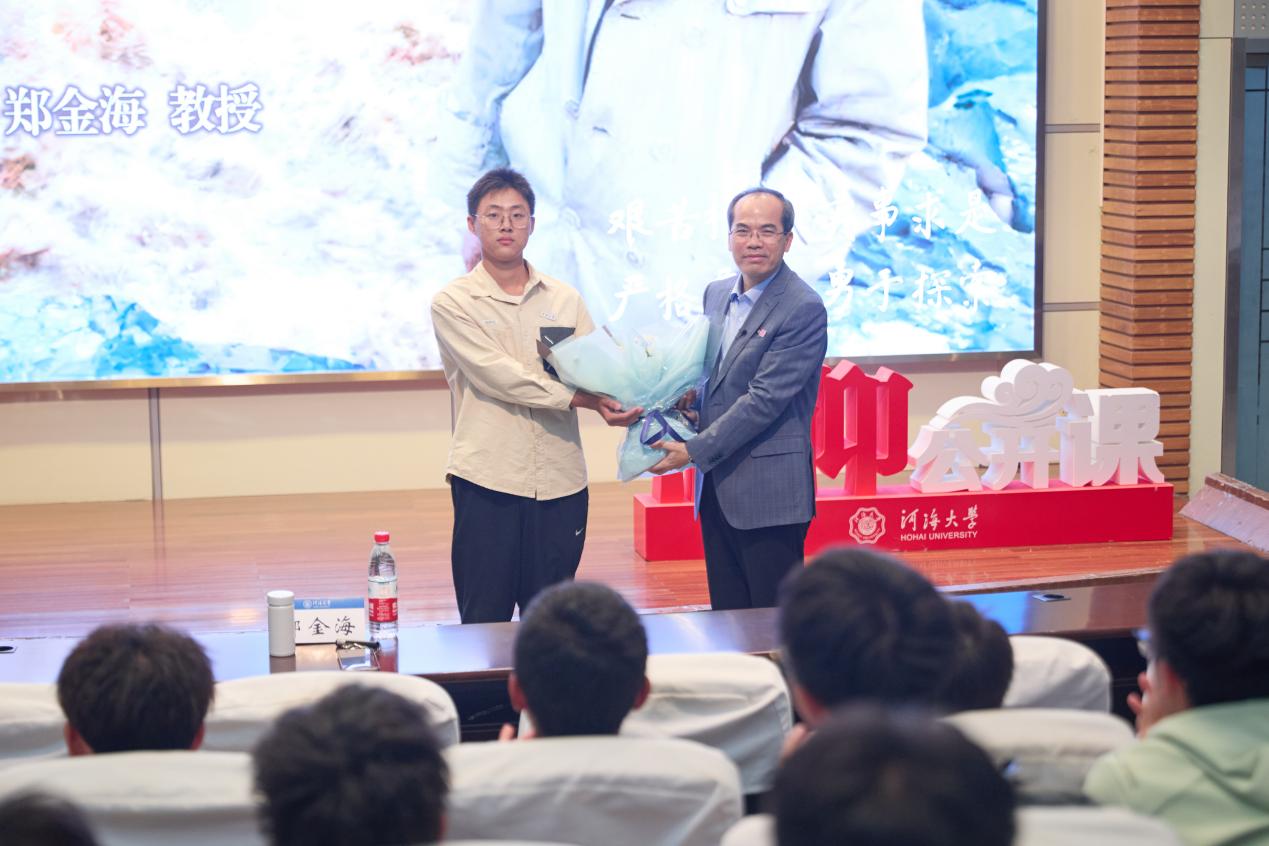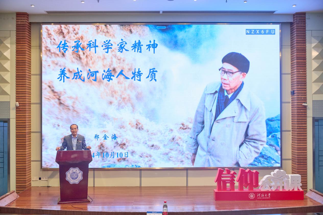 郑金海教授介绍了严恺院士前往荷兰求学深造的经历,通过分享严恺院士学习并掌握多国语言的传奇故事,鼓励新生要用开放的视野拥抱世界。他用当年严恺院士申请回国参加抗战的书信,展现了严恺院士耕植于血脉的深厚家国情怀,用生动的故事讲述了严恺院士为华东水利91论坛 、91论坛 服务五十余年的深厚情感,以及大力推动海峡两岸及国际学术研讨会产生的重要影响。郑金海教授讲解了严恺院士开启中国河口研究的重要意义,其推进长江口治理、葛洲坝枢纽、三峡工程、南水北调工程等重大水利工程建设情况,主动承担科研论证、著作出版、公众科普等责任。他还阐述了严恺院士临危受命建设天津新港,开启了淤泥质海岸建港研究的新河;提出斜坡堤作为全新的结构形式,加强海岸防护,保护人民财产安全;开展第一次全国海岸带和海涂资源综合调查研究,用脚步丈量万里海疆,获国家科技进步一等奖。