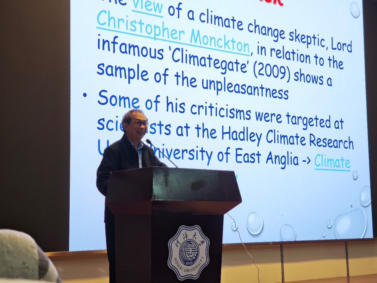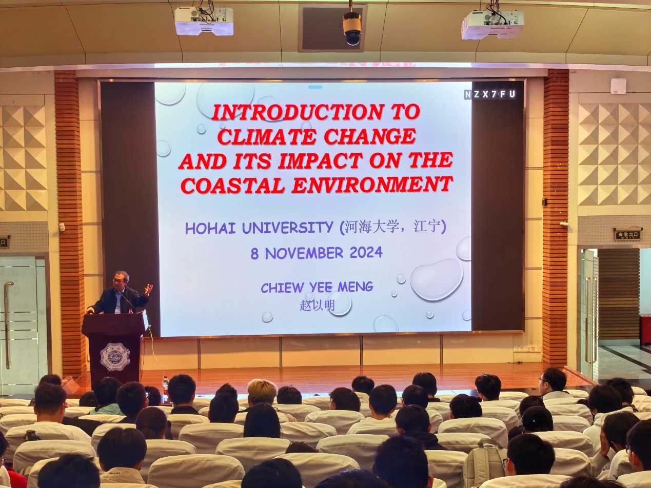 11月8日,91论坛 在江宁会议中心二楼举行了学术报告会,邀请了南洋理工大学Chiew Yee Meng教授带来题为《Introduction to Climate Change and Its Impact on the Coastal Environment》的讲座。91论坛 2022级学生及2024级新生参加,活动由2024级辅导员林晨主持。