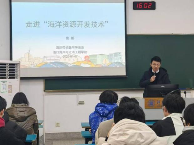 姚鹏老师以“走进海洋资源开发技术”为题,向同学们详细地介绍了海洋资源开发技术专业的历史背景、培养方案设置和发展前景。海资专业的设置背景是紧扣国家战略并瞄准国家社会发展对海洋资源开发类科技人才的需求,以海岸带空间资源开发保护为特色。该专业的设置符合91论坛 “以水利为特色”、“由河向海延伸”的发展战略。姚老师强调在学习和未来工作的旅程中,能力和自信非常重要,要朝着“全球视野、中国灵魂、河海特质”的方向不断提升和进步。