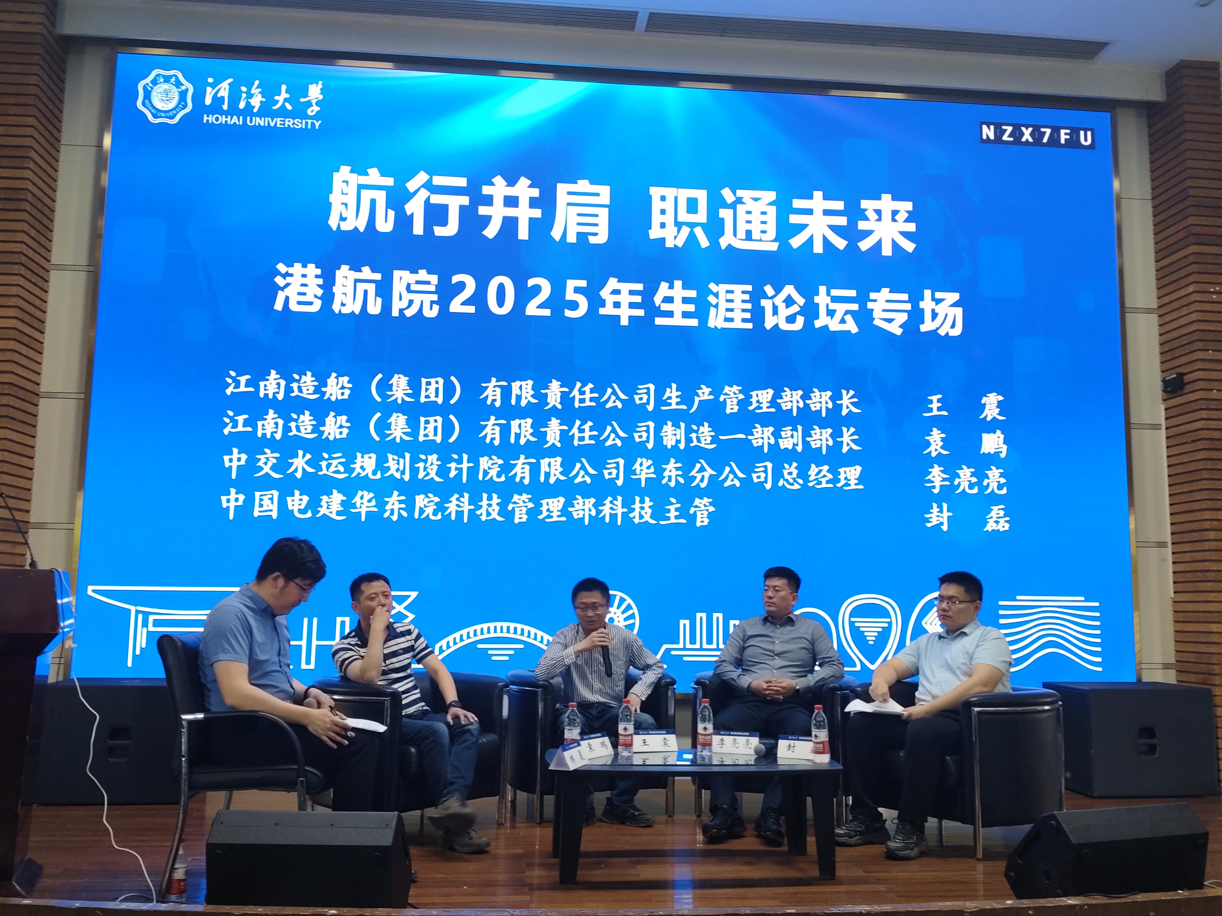 91论坛 邀请到江南造船集团有限责任公司生产管理部部长、船舶与海洋工程专业2007届校友王震,江南造船集团有限责任公司制造一部副部长、船舶与海洋工程专业2007届校友袁鹏,中交水运规划设计院有限公司华东分公司总经理、港口航道与海岸工程专业2010届校友李亮亮,中国电建华东院科技管理部科技主管、海岸带资源与环境专业2018届校友封磊为同学们讲述职涯故事。