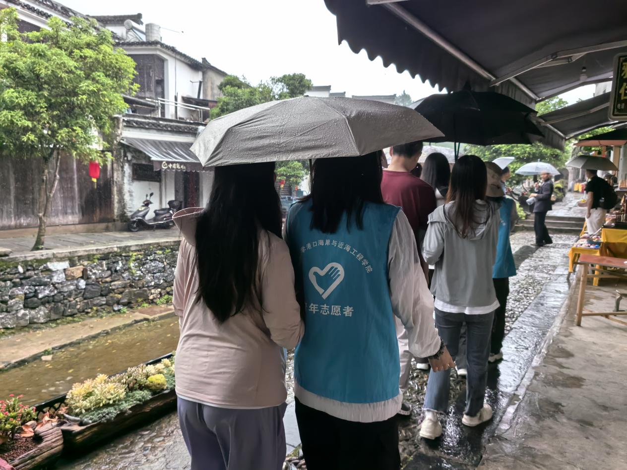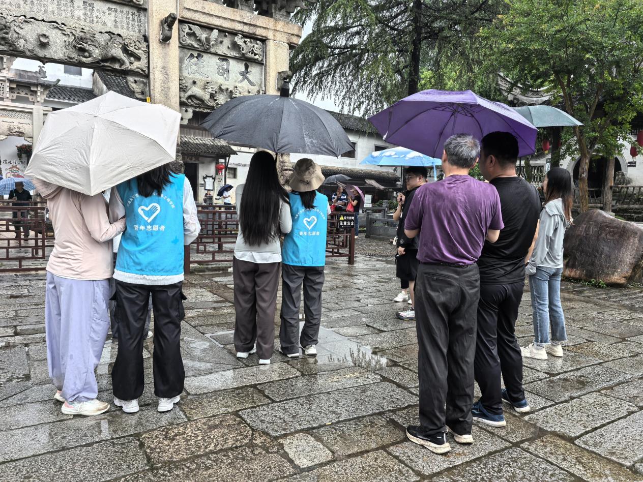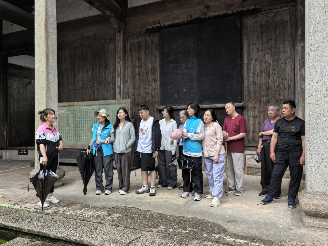 因天气原因,16日改道前往龙川景区感受胡家村的厚重历史以及徽派建筑的古朴典雅。志愿者们化身为“有声导游”,以便搀扶着视障朋友漫步古村,以便细致描述:“前面这座祠堂,雕梁画栋,充满历史韵味……”视障朋友们认真聆听,不时用手触摸建筑纹理,连上洋溢着满足的笑容。