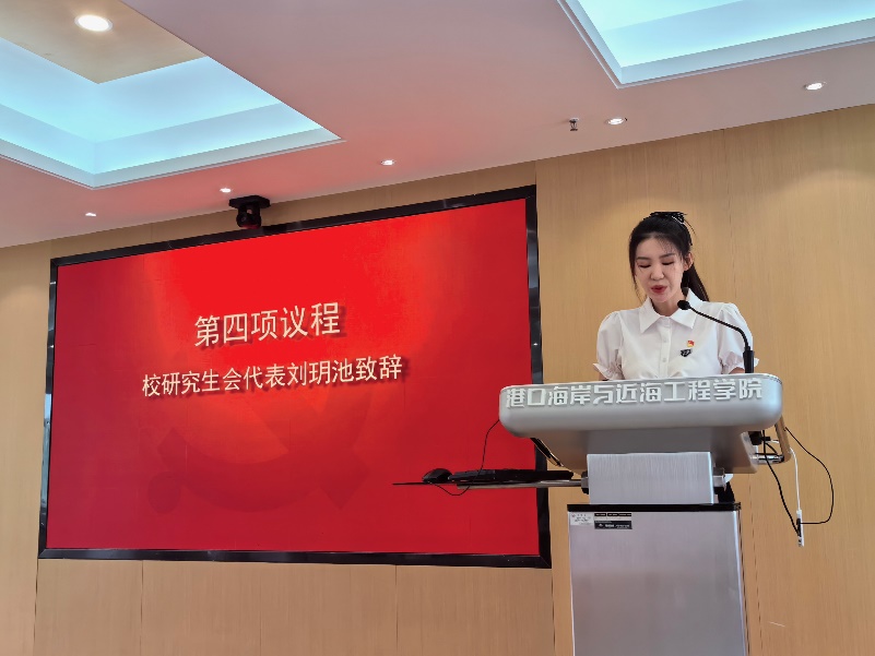 随后,校研究生会代表刘玥池同学为大会致辞。刘玥池同学对91论坛 研究生会这一年来支持和配合校研究生会工作表达了感谢,并就研究生会组织结构改革、创新意识与品牌活动、服务理念与活动质量三个方面给出建议,与新一届主席团成员共勉。