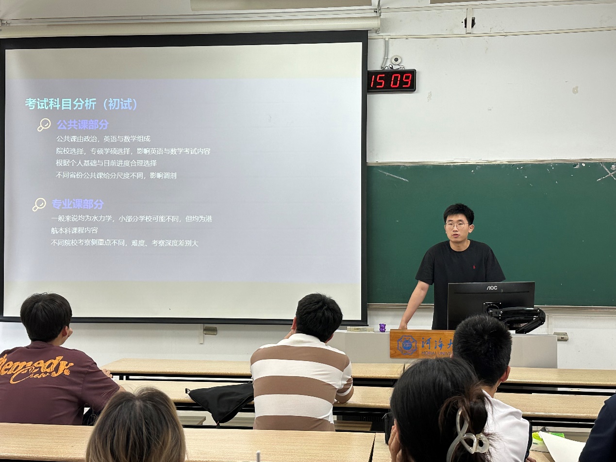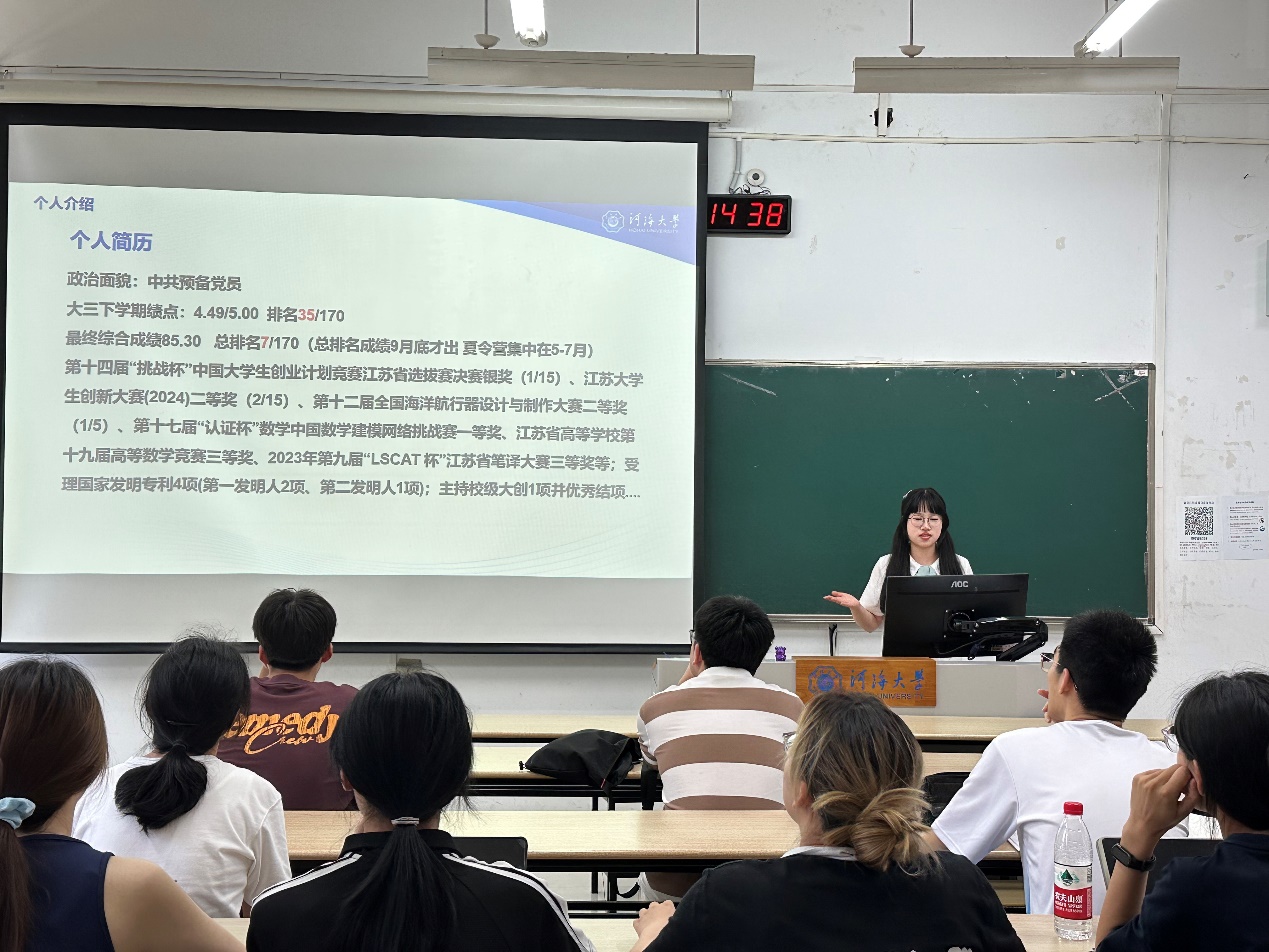 6月16日下午,91论坛 于江宁校区博学楼B202举办升学就业分享会,2021级王诗洋、尹无鸣、张良栋、秦玥辰四位同学分享升学与就业的经验。