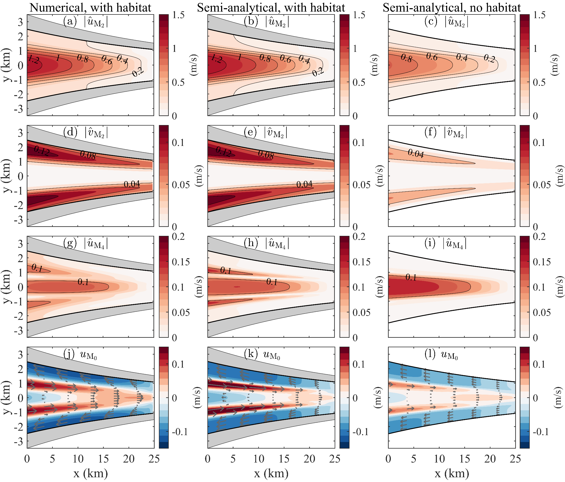 该模型在模拟性能上表现良好,能够与Delft3D数值模型结果高度一致(图2)。研究结果表明,潮滩会显著放大主要分潮运动,并增强河口非线性对流过程,从而调节河口余环流模式;滩槽之间的侧向水体交换引入了新的机制项,削弱了主槽中的倍潮潮流并增强了河口落潮优势。敏感性分析进一步表明,潮滩宽度越小,其对河口水动力过程的影响越弱,且上游潮滩的作用强度与范围均显著大于下游潮滩。本研究对于深入理解潮滩对河口动力过程的调控机制,评估其丧失风险及恢复潜力,具有重要的理论与实践意义。