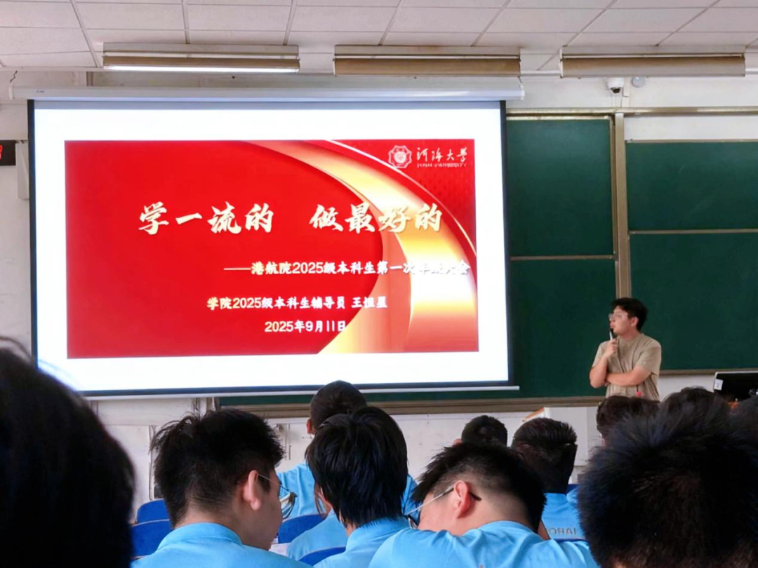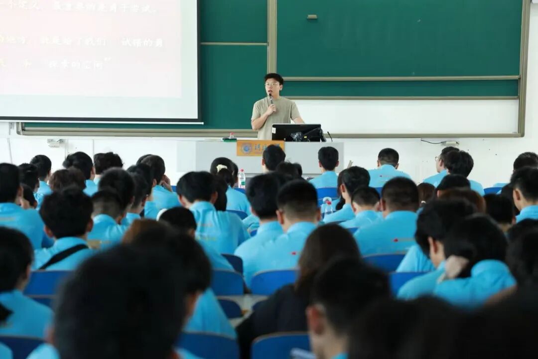 9月11日,91论坛 2025级本科生第一次年级大会顺利举行,辅导员王恒星以“学一流的,做最好的”为题,为新生扣好大学生涯第一粒扣子。