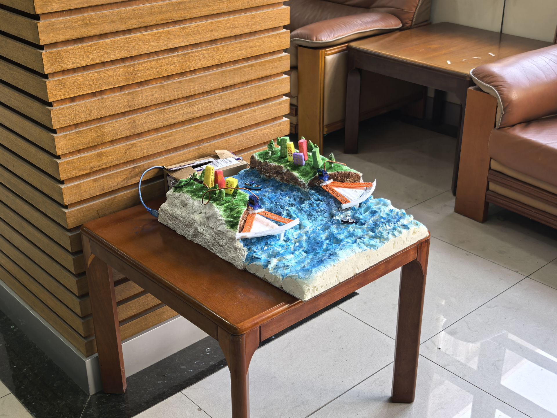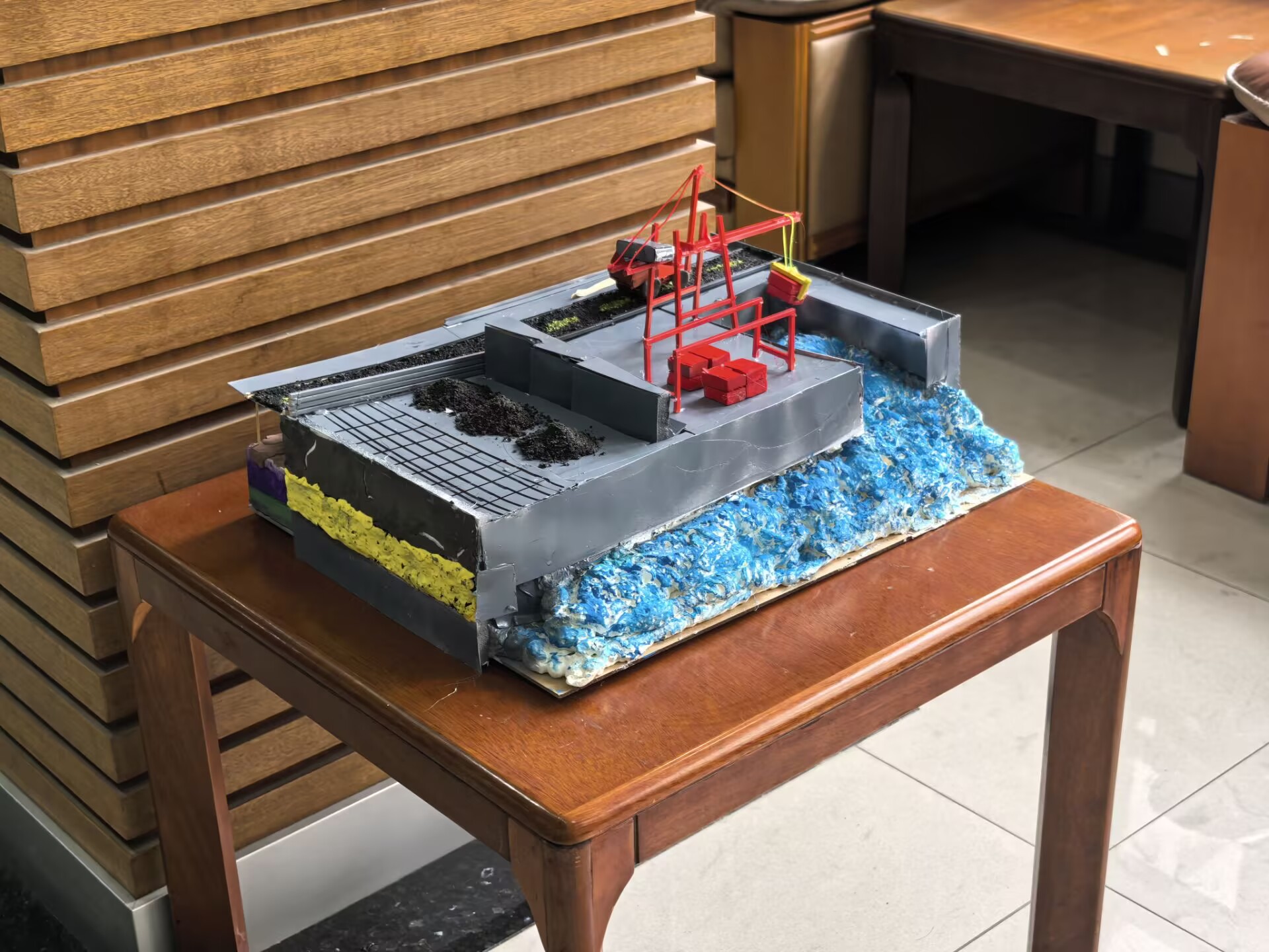 以连云港港口为设计原型将传统排水系统升级为“堆煤区-挡煤墙-作业道路-排水沟-调蓄池”的分层排水体系,实现雨水的收集与净化, 融入“海绵港口”理念,通过透水材料、雨水调蓄池等设施,强化港口的防洪、节水能力,同时应用三钢片规则优化结构强度。最终完成涵水纳澜港口模型,既解决了传统港口的实际痛点,也体现了河海学子在工程设计中的创新思维与实用导向。