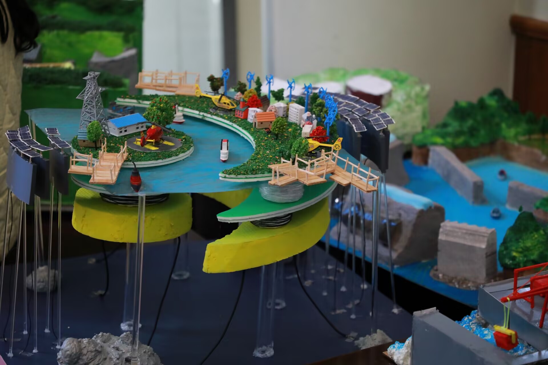 为缓解陆上土地资源的紧缺的同时响应国家清洁能源的需求,我们组充分考虑海洋环境的不稳定性后,设计了按主浪方向布局的不同的三级式防波堤,双层TMD可调谐减震装置,多点式系泊等构造,既充分收集海洋波浪能,太阳能,风能,又建立了一个稳定的海上环境,供给人们进行休闲度假。
