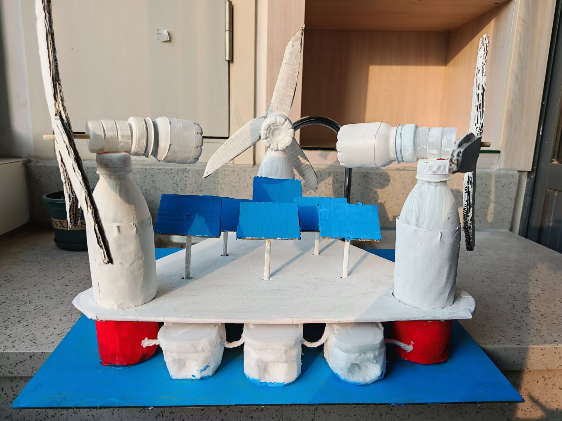 考虑到当今海洋生态污染日益加重和全球能源危机,我们将海洋垃圾的收集与清洁能源的生产集成于一个装置中。将海洋垃圾收集装置与海上风力发电机组结合,同时为了提升整个装置的空间利用率,从而达到提升效率的效果,我们在风机形成的空间内搭建平台,放置太阳能板进行发电。最终设计出本作品—蔚海引擎,以此为我国加快建设海洋强国战略奉献力量。
