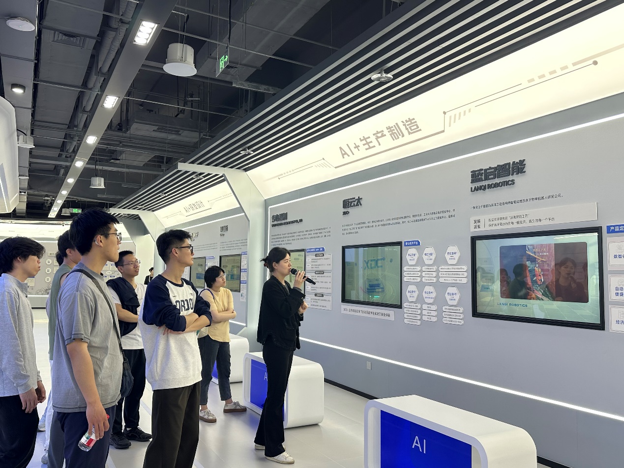 在犀数工场人工智能展示馆,师生了解多模态大模型、智能传感器、计算机视觉等AI标杆企业和成熟解决方案,学习 AI 赋能研发设计、生产制造、运维服务等制造业全价值链场景。学生在一家专注于船舶与海洋工程结构物智能运维的水下特种机器人研发公司驻足,并与讲解员深度交流。
