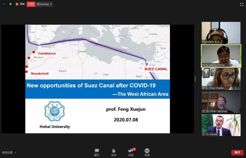 The theme of Professor Feng Xuejun's speech is: New Opportunities of Suez Canal After Covid-19-The West African Area, pointing out that the COVID-19 epidemic has brought great challenges to Suez Canal, but also brought opportunities to build a trans-shipment hub of Far East-Europe route for the development of West Africa region under the background of large-scale ships, transform and upgrade port and shipping infrastructure, and accelerate the research and development and application of new technologies such as artificial intelligence, 5G and unmanned ships in the shipping industry. In the summary of the meeting, President Ismail highly praised Hohai University for its important role in the development of international shipping, and thanked Professor Feng for his attention to the development of the Arab League, especially the Suez Canal, and for his wonderful speech. The Chinese Consulate General in Alexandria also spoke highly of Professor Feng's speech, holding that the content of the speech played an important guiding role in Africa's development, well publicized and promoted the national the One Belt and One Road Initiative  from the height of scientific research, and specially sent a thank-you letter to Hohai University.