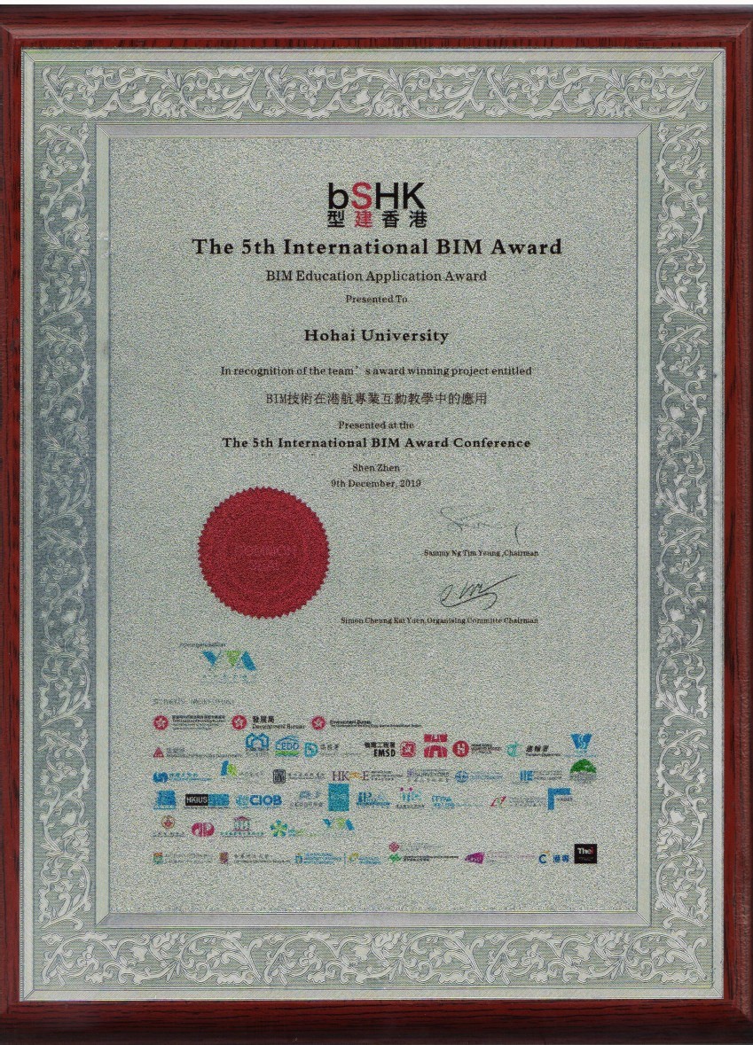 On December 9, 2019, the 5th International BIM Grand Prix and Summit Forum, which was sponsored by the building SMART Hong Kong (bSHK), was held in Shenzhen. The competition received more than 600 entries from China, the United States, Germany and other countries. Guided by Dr. Wang Huakun, Dr. Zhai Qiu, Prof. Zhang Wei and Dr. Ouyang Feng, the delegate group from our college, inclding Zhang Jiahao, Yan Sihan, Zhang Shujian, Zhou Nan, Pan Tianjiao and Sun Jie, jointly completed the work Application of BIM Technology in Interactive Teaching of Harbour and Waterway Major and won the “BIM Education Application Award” in this competition, realizing the breakthrough of zero international award in BIM competition.
